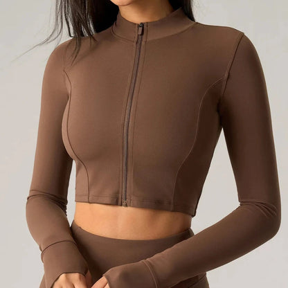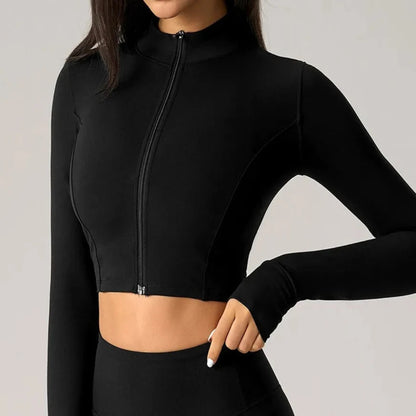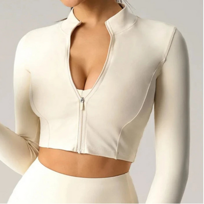 The Valora Jacket combines performance and elegance in one refined design. Crafted from premium sculpting fabric, it features a sleek cropped fit that enhances the natural shape while allowing full freedom of movement. The extended sleeves with integrated thumbholes provide both comfort and functionality, keeping the jacket in place during every move. Finished with minimalist lines and a smooth zip closure, the Valora Jacket is the statement layer that defines confidence from studio to street.